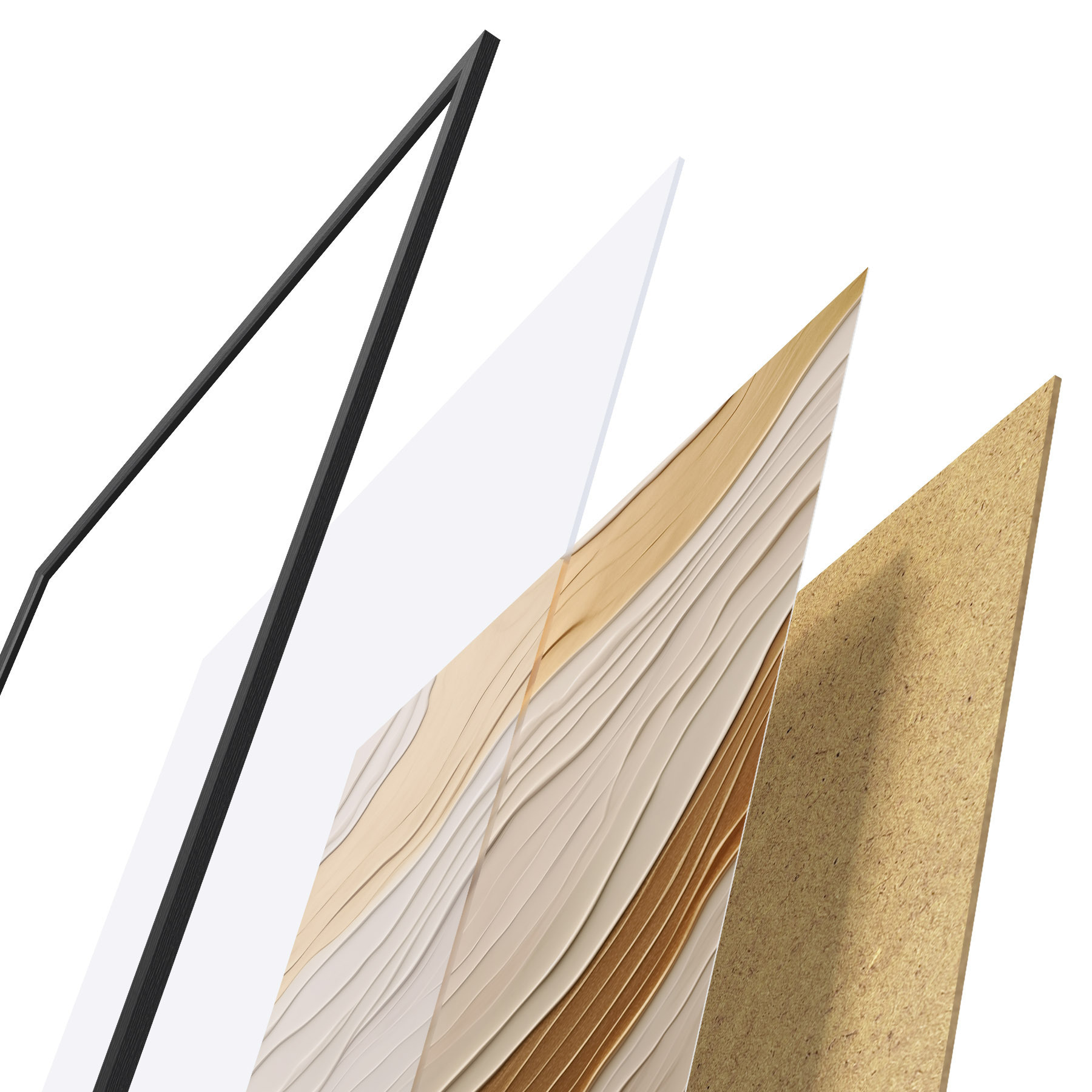 Plakatą sudaro rėmas, pleksiklas, atspausdintas vaizdas ir medžio drožlių plokštės pagrindas. Plakatą galima iš karto pakabinti ant sienos dėl kitoje pusėje esančių laikiklių.