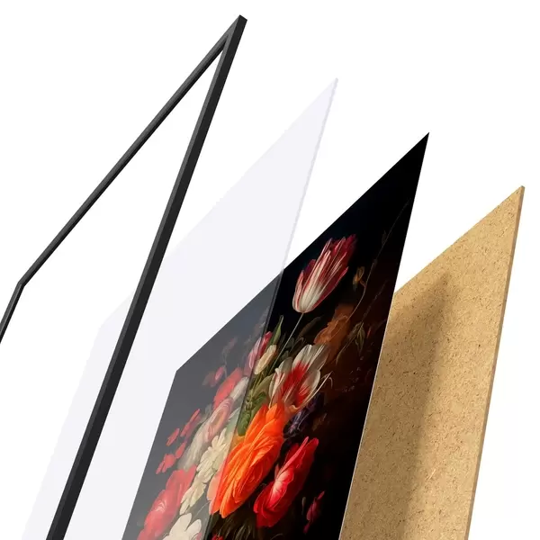 Plakatą sudaro rėmas, pleksiklas, atspausdintas vaizdas ir medžio drožlių plokštės pagrindas. Plakatą galima iš karto pakabinti ant sienos dėl kitoje pusėje esančių laikiklių.