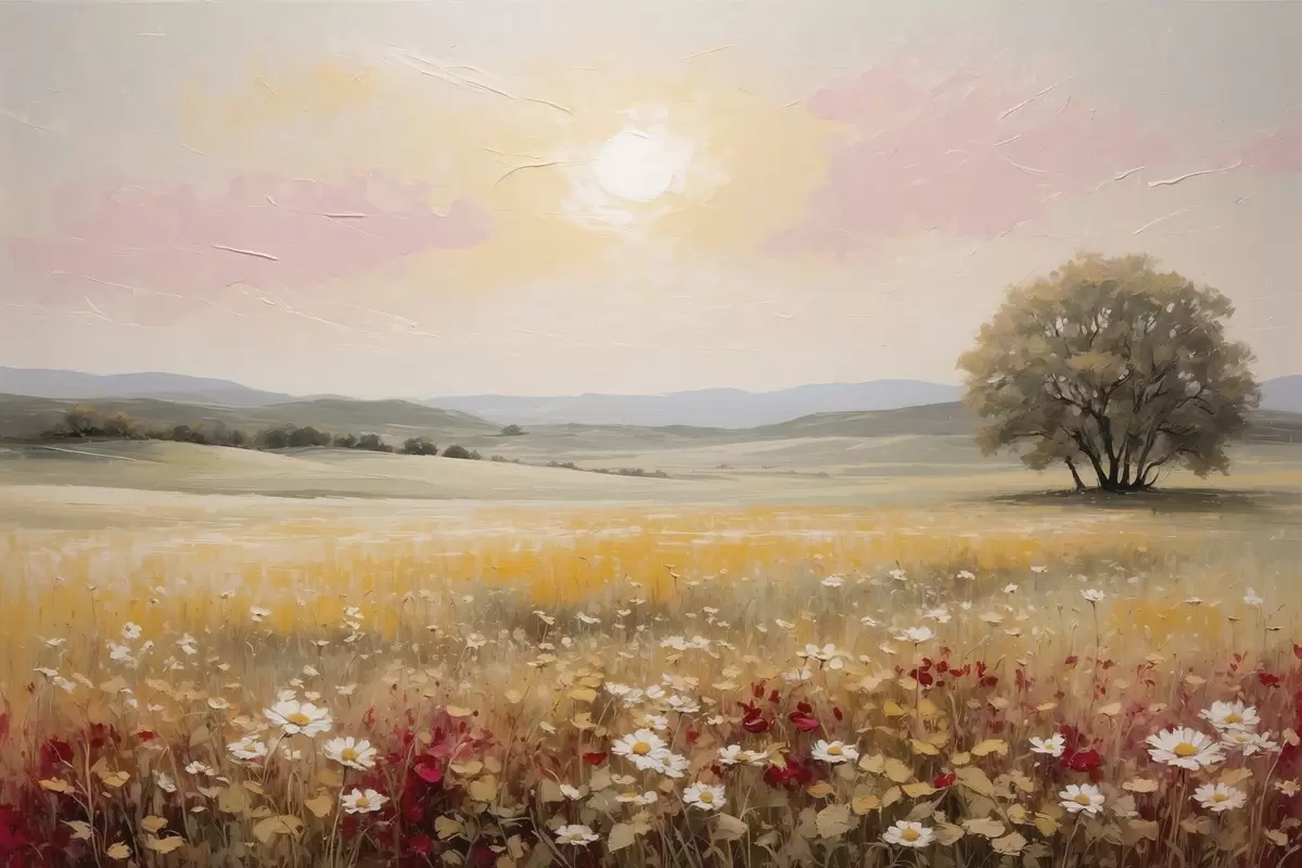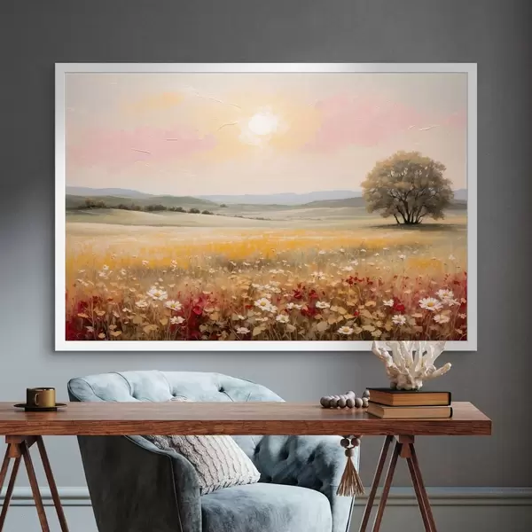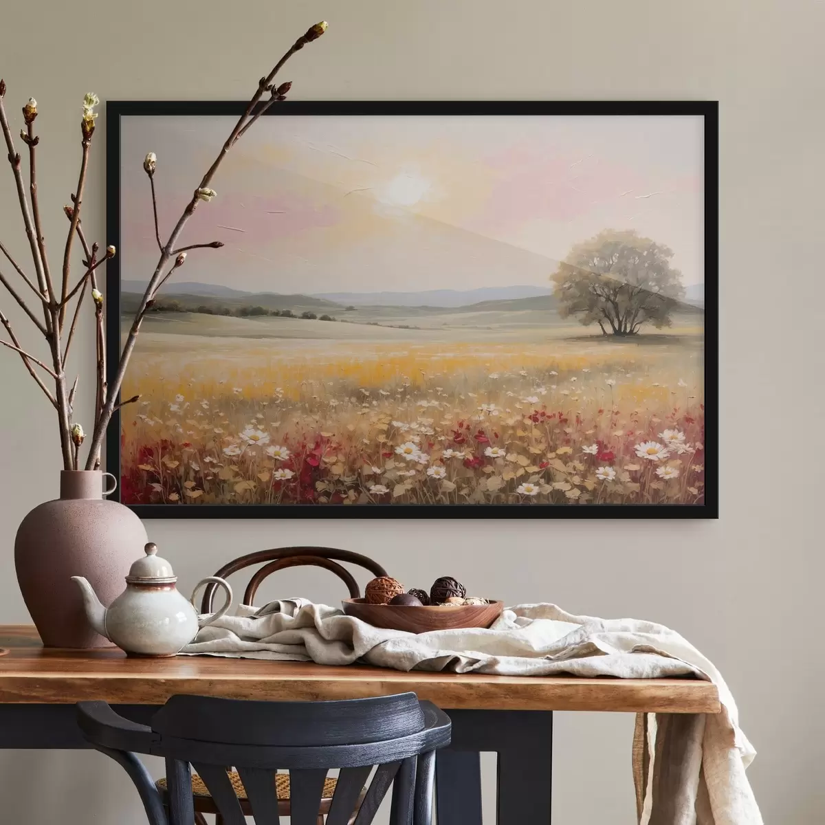 Plakatas Peizažas su gėlių lauku ir medžiu horizonte f48355