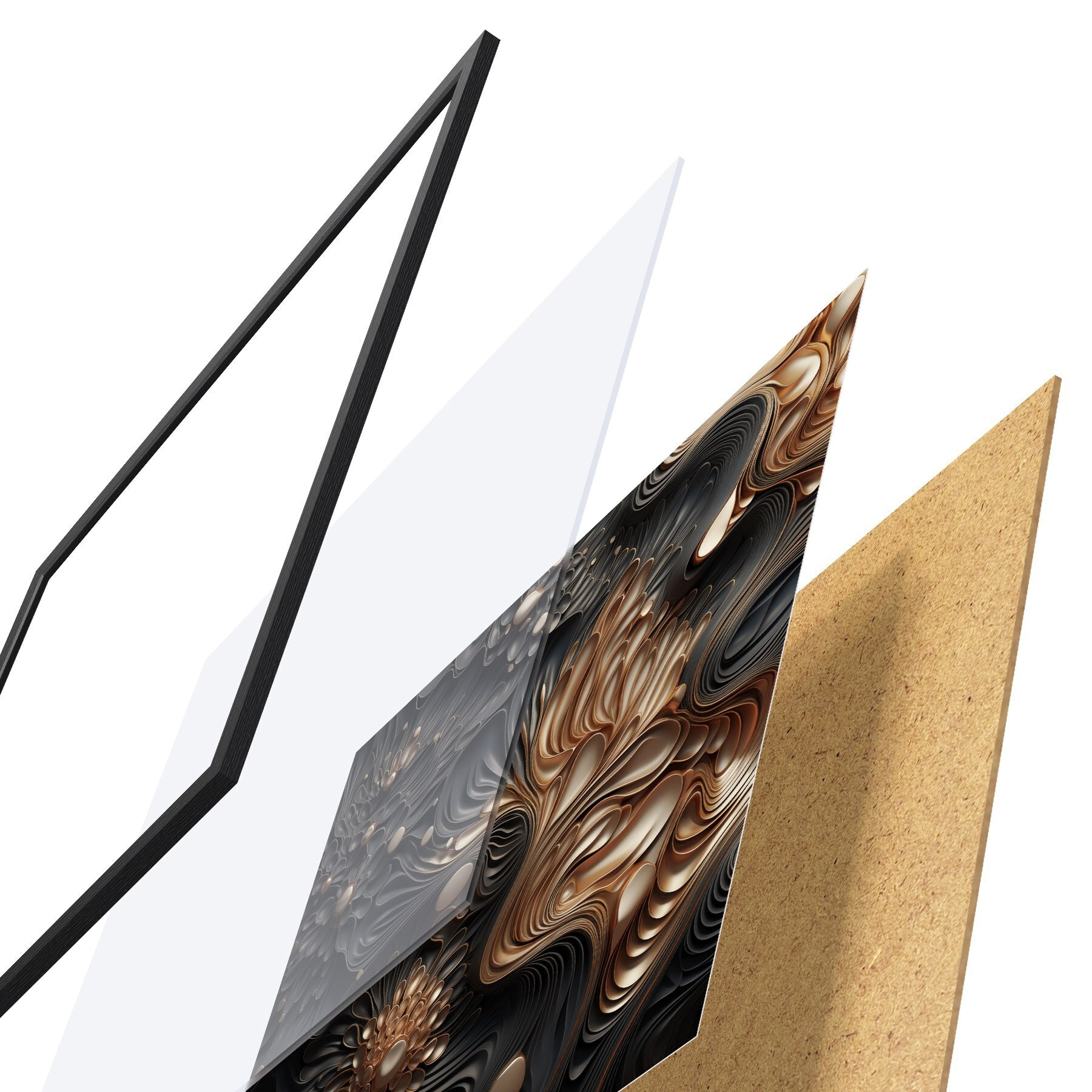 Plakatą sudaro rėmas, pleksiklas, atspausdintas vaizdas ir medžio drožlių plokštės pagrindas. Plakatą galima iš karto pakabinti ant sienos dėl kitoje pusėje esančių laikiklių.