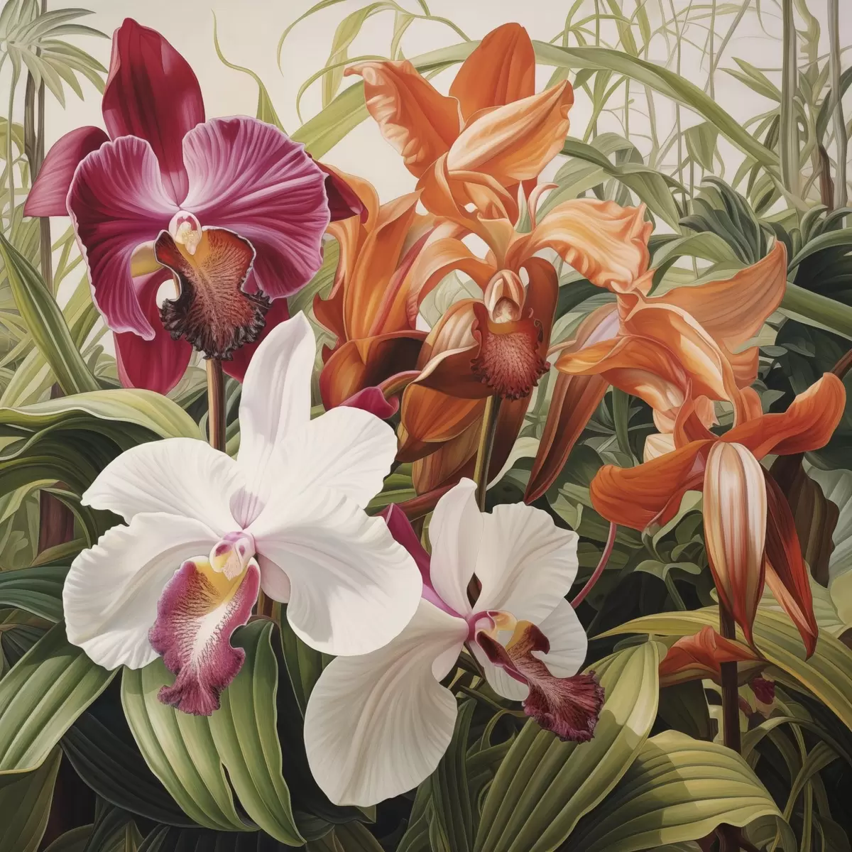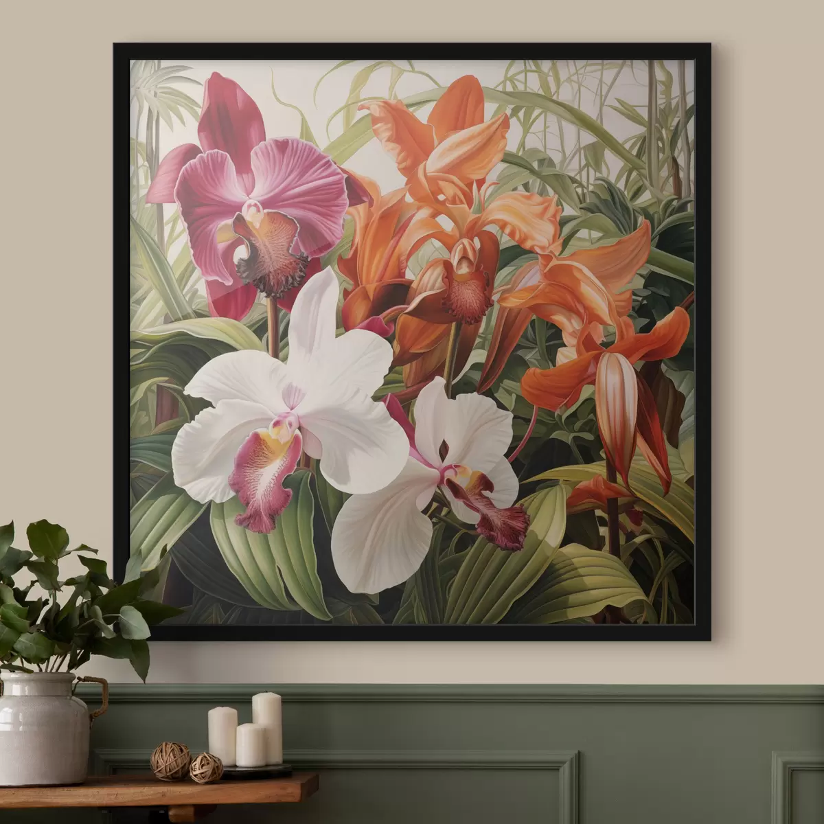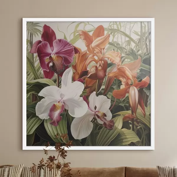 Plakatas Tropinių gėlių puokštė, orchidėjos su žaliais lapais fone f48386