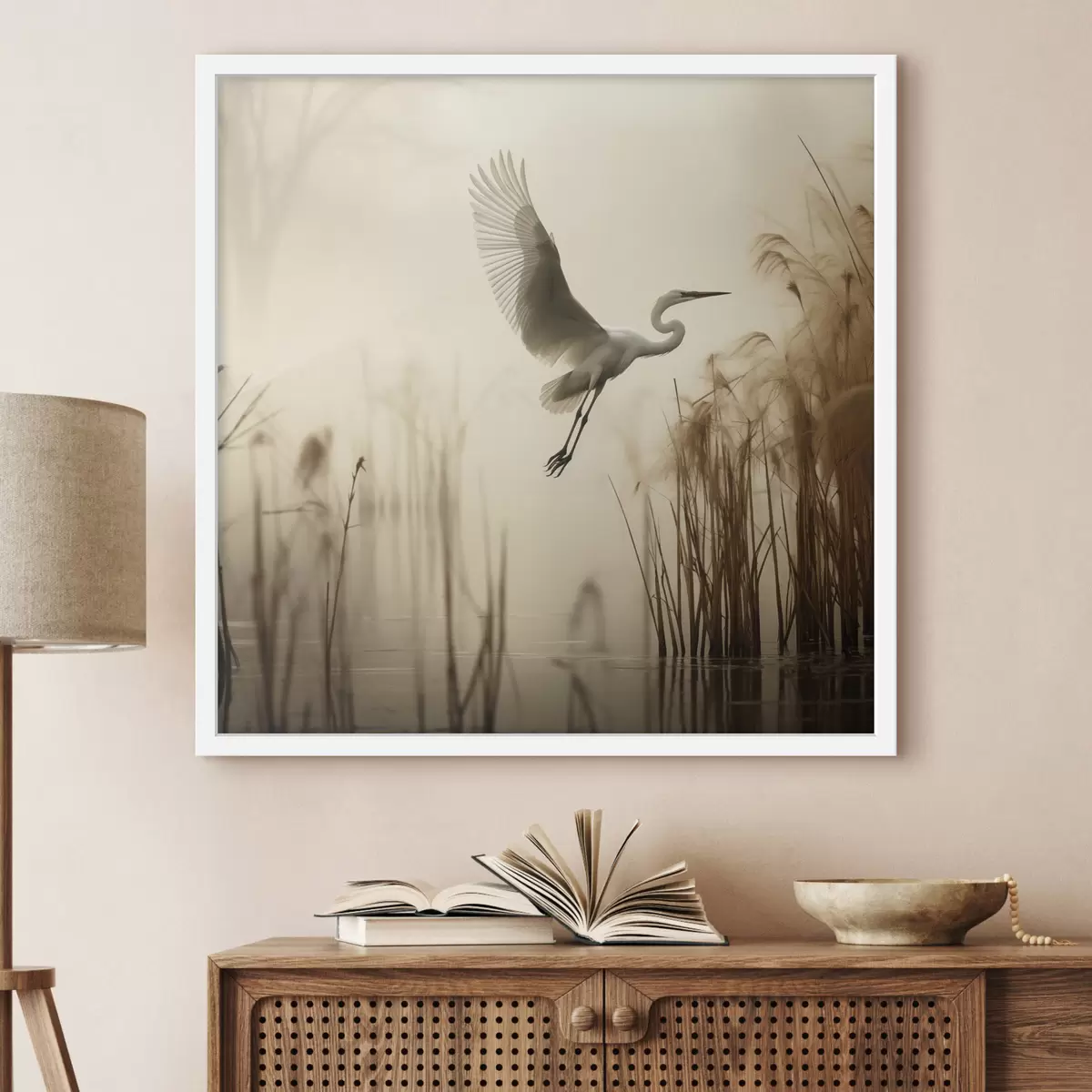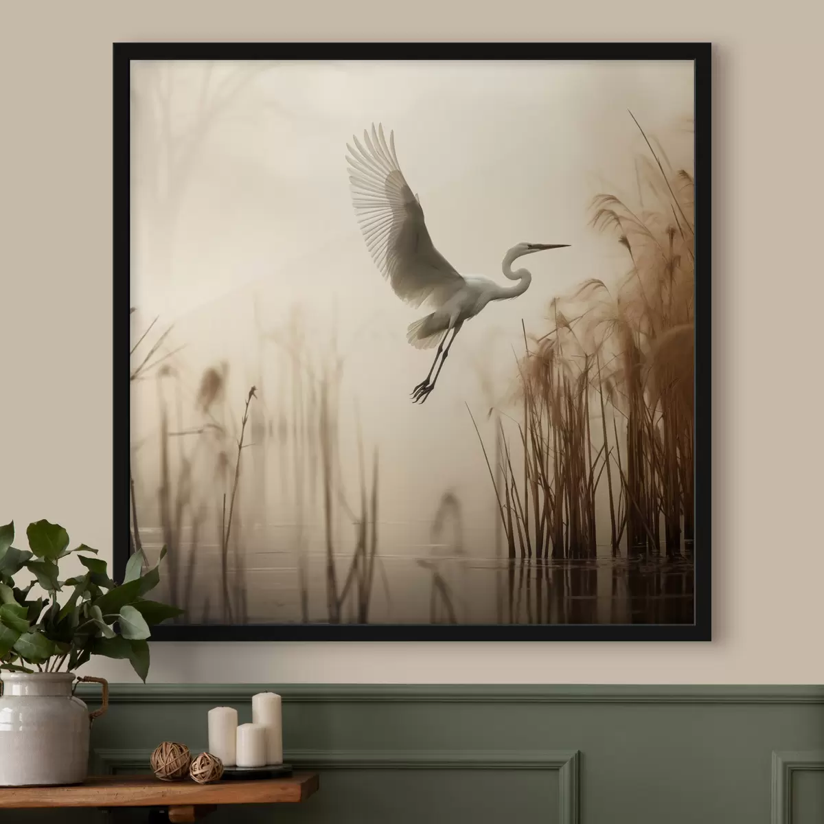 Plakatas Balta garzetta skraido virš ežero, kurį supa aukšti nendrės, o fone matyti medžiai f48389