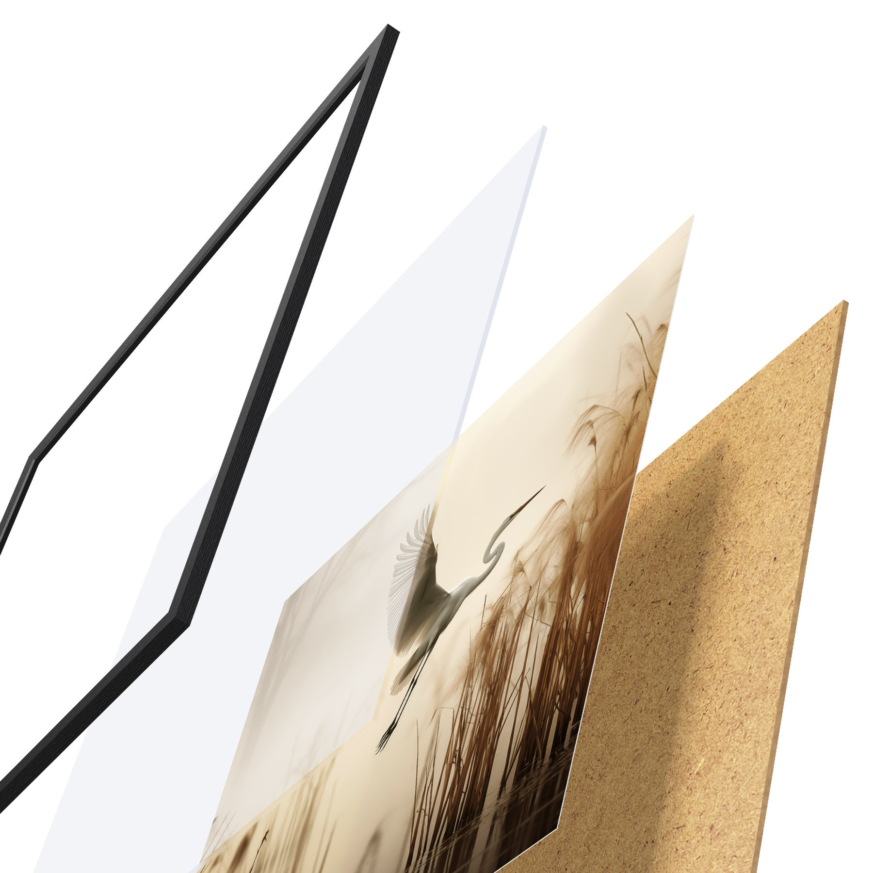 Plakatą sudaro rėmas, pleksiklas, atspausdintas vaizdas ir medžio drožlių plokštės pagrindas. Plakatą galima iš karto pakabinti ant sienos dėl kitoje pusėje esančių laikiklių.