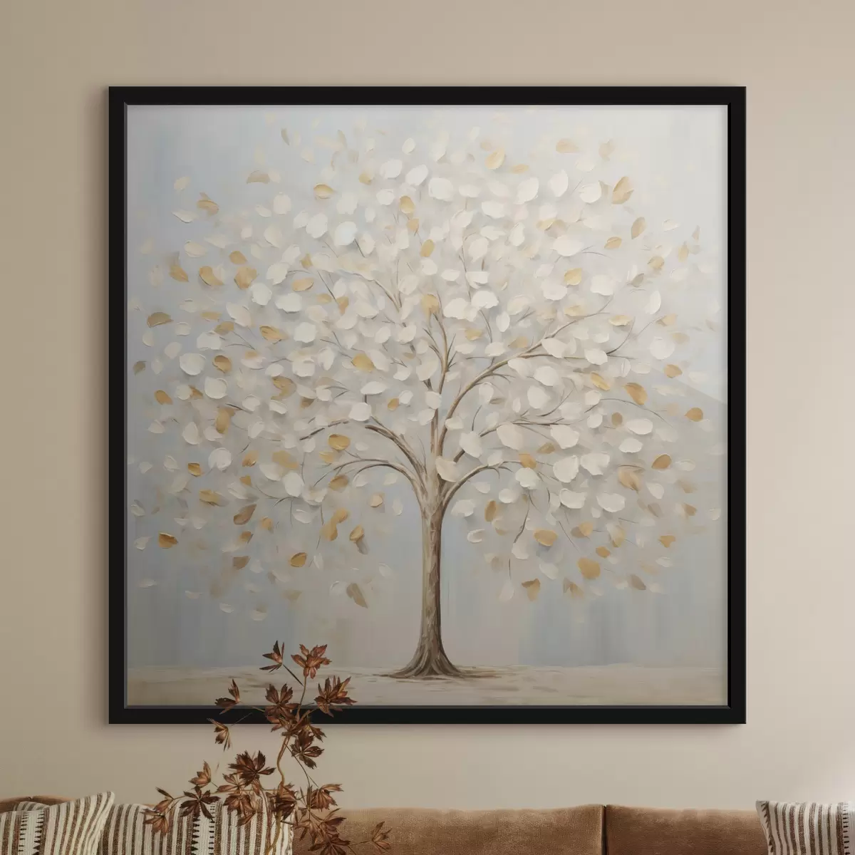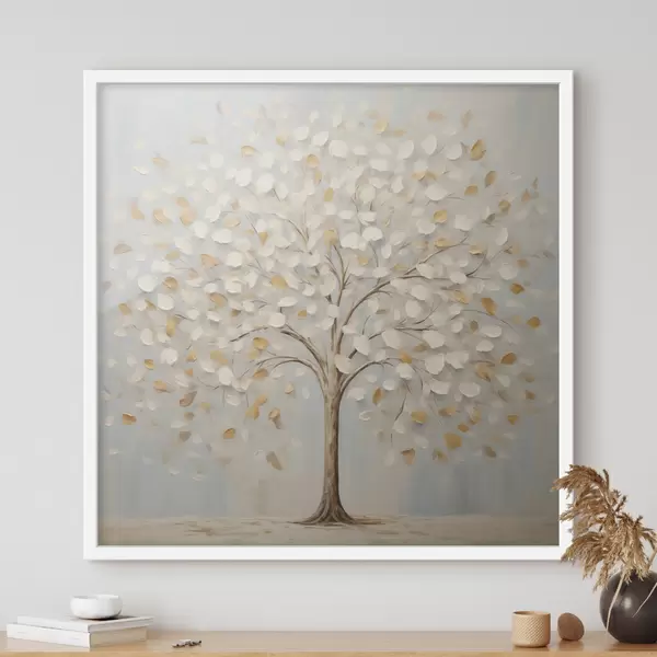 Plakatas Tekstūrinis paveikslas, vaizduojantis medį su baltais ir geltonais lapais prieš šviesiai mėlyną foną f48391