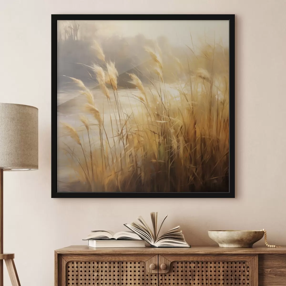 Plakatas Pirmame plane – aukšta, išdžiūvusi žolė su varpeliais, o fone – ežeras ir medžiai Ne f48394