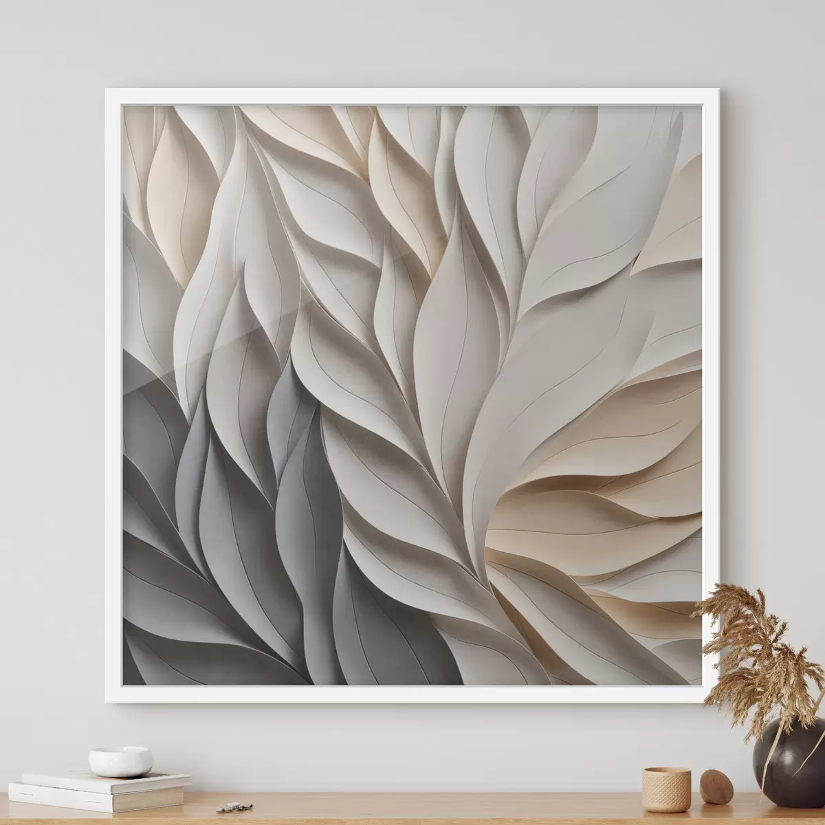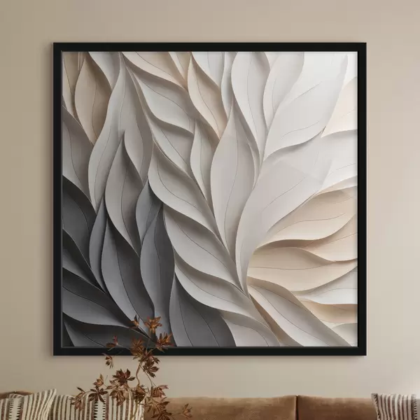 Plakatas Tekstūruotos, viena kitą dengiančios abstrakčios lapų formos neutralių atspalvių – smėlio, kreminės ir pilkos spalvų f48407