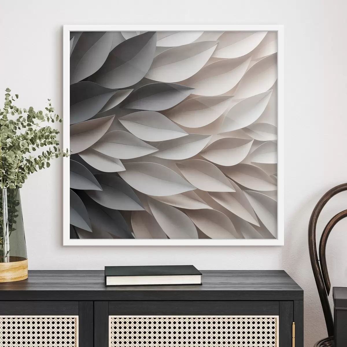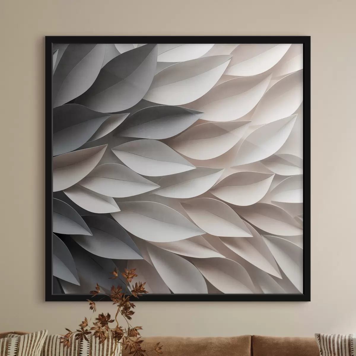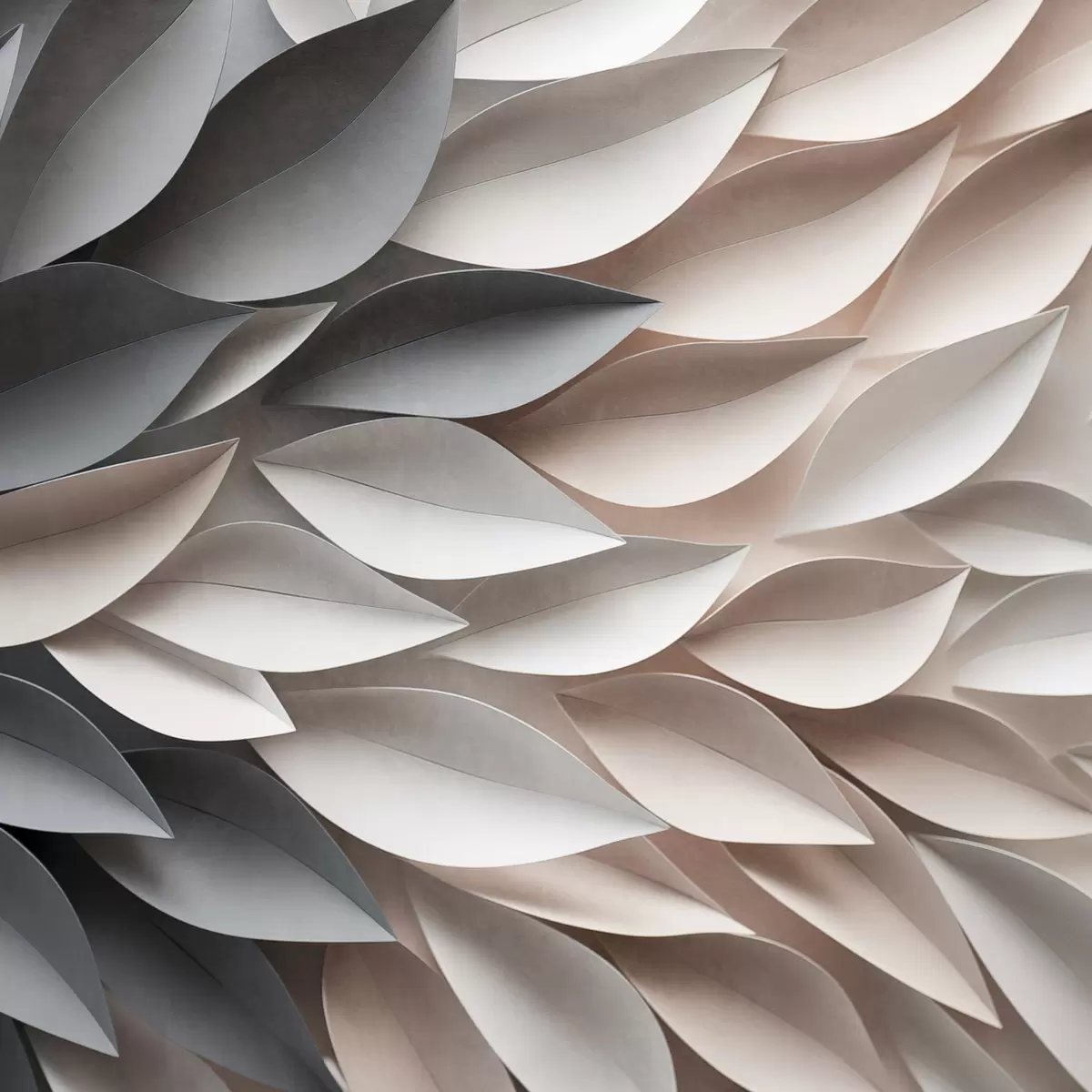 Plakatas Tekstūruotos, viena kitą dengiančios abstrakčios lapų formos neutralių atspalvių – smėlio, kreminės ir pilkos spalvų f48408