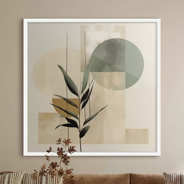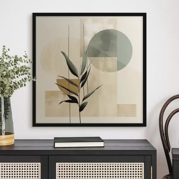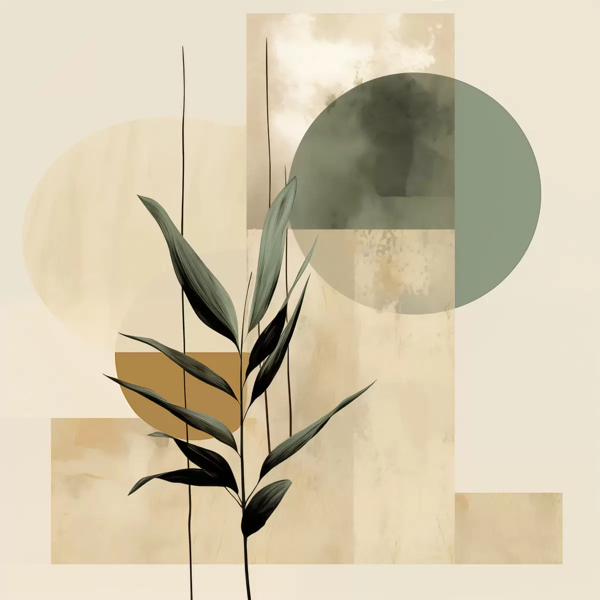 Plakatas Tamsiai žali augalai su abstrakčiomis geometrinėmis figūromis ir akvarelinėmis tekstūromis smėlio bei žalios spalvos f48409