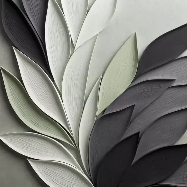 Plakatas Abstrakčios stilizuotos lapų kompozicijos pilkos, baltos ir prislopintos žalios spalvų atspalviais f48411