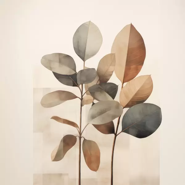 Plakatas Aukšti augalai su ovalo formos lapais, nudažytais švelniomis spalvomis ir abstrakčiomis stačiakampėmis formomis f48413