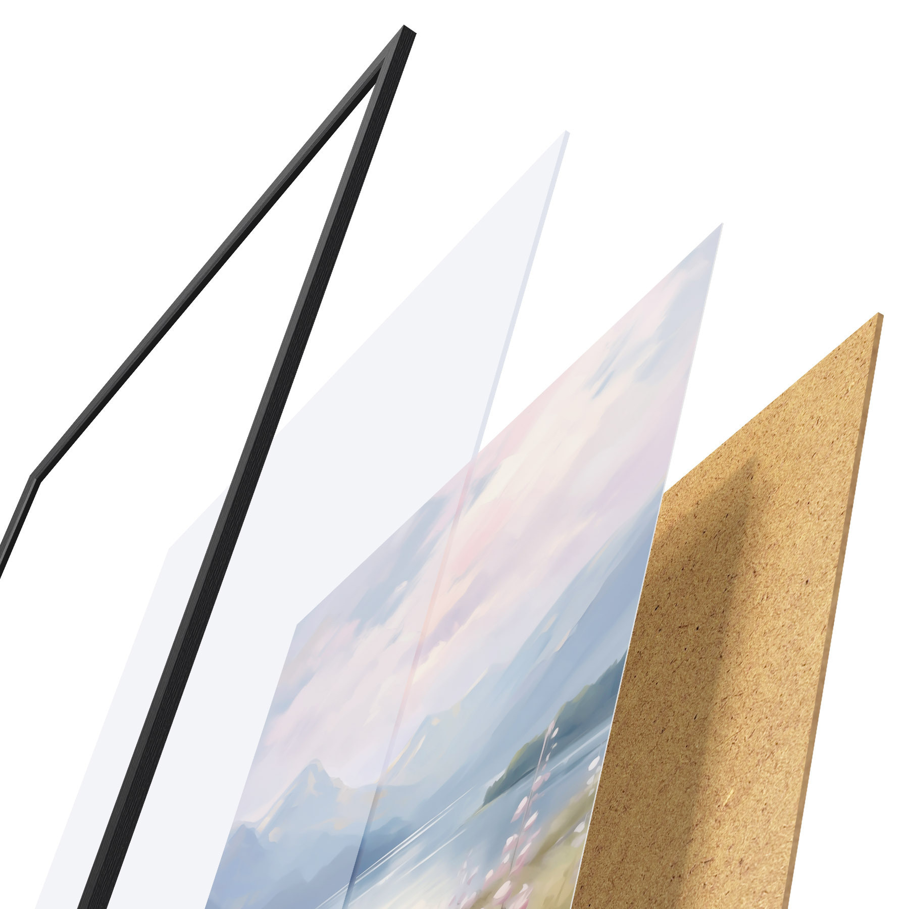 Plakatą sudaro rėmas, pleksiklas, atspausdintas vaizdas ir medžio drožlių plokštės pagrindas. Plakatą galima iš karto pakabinti ant sienos dėl kitoje pusėje esančių laikiklių.