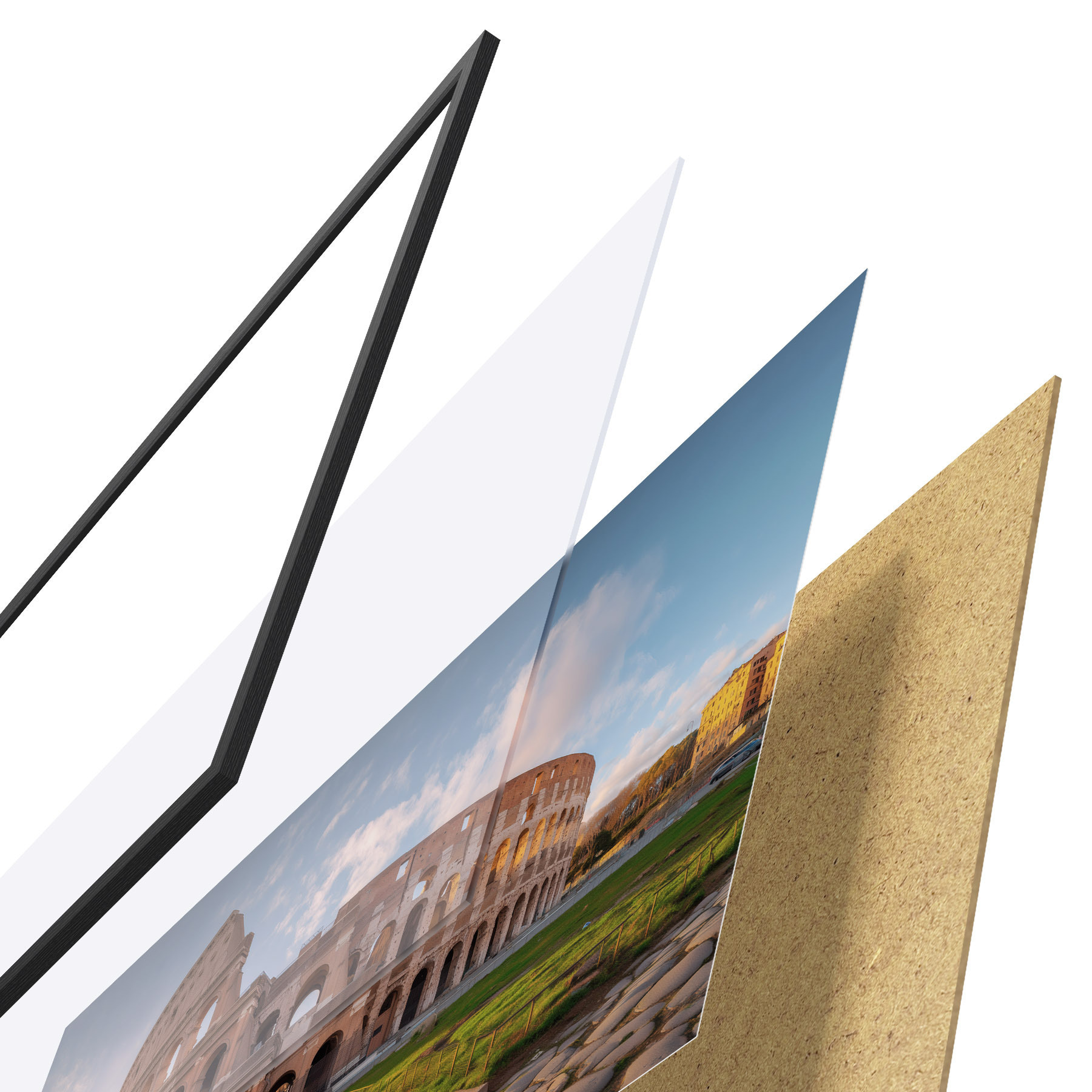 Plakatą sudaro rėmas, pleksiklas, atspausdintas vaizdas ir medžio drožlių plokštės pagrindas. Plakatą galima iš karto pakabinti ant sienos dėl kitoje pusėje esančių laikiklių.