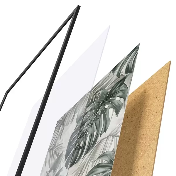 Plakatą sudaro rėmas, pleksiklas, atspausdintas vaizdas ir medžio drožlių plokštės pagrindas. Plakatą galima iš karto pakabinti ant sienos dėl kitoje pusėje esančių laikiklių.