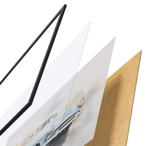 Plakatą sudaro rėmas, pleksiklas, atspausdintas vaizdas ir medžio drožlių plokštės pagrindas. Plakatą galima iš karto pakabinti ant sienos dėl kitoje pusėje esančių laikiklių.