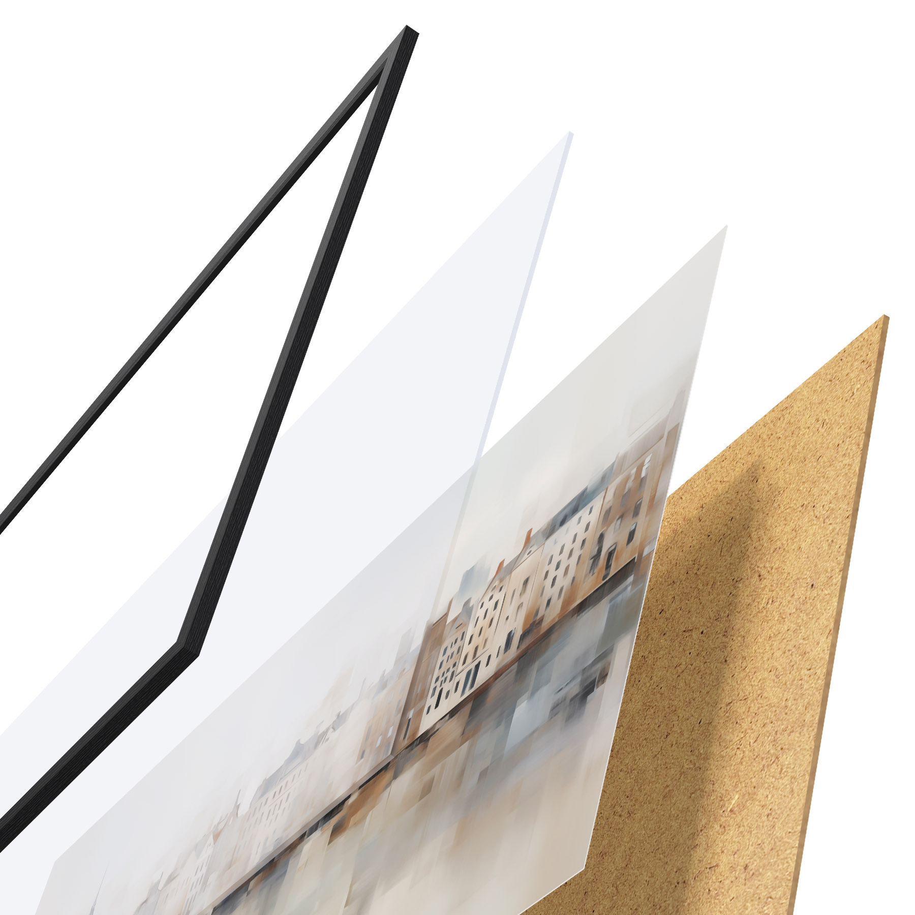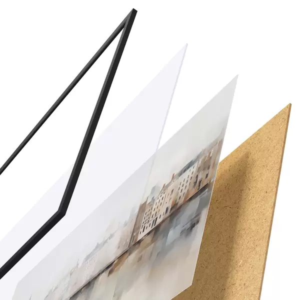 Plakatą sudaro rėmas, pleksiklas, atspausdintas vaizdas ir medžio drožlių plokštės pagrindas. Plakatą galima iš karto pakabinti ant sienos dėl kitoje pusėje esančių laikiklių.