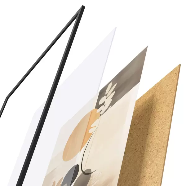 Plakatą sudaro rėmas, pleksiklas, atspausdintas vaizdas ir medžio drožlių plokštės pagrindas. Plakatą galima iš karto pakabinti ant sienos dėl kitoje pusėje esančių laikiklių.