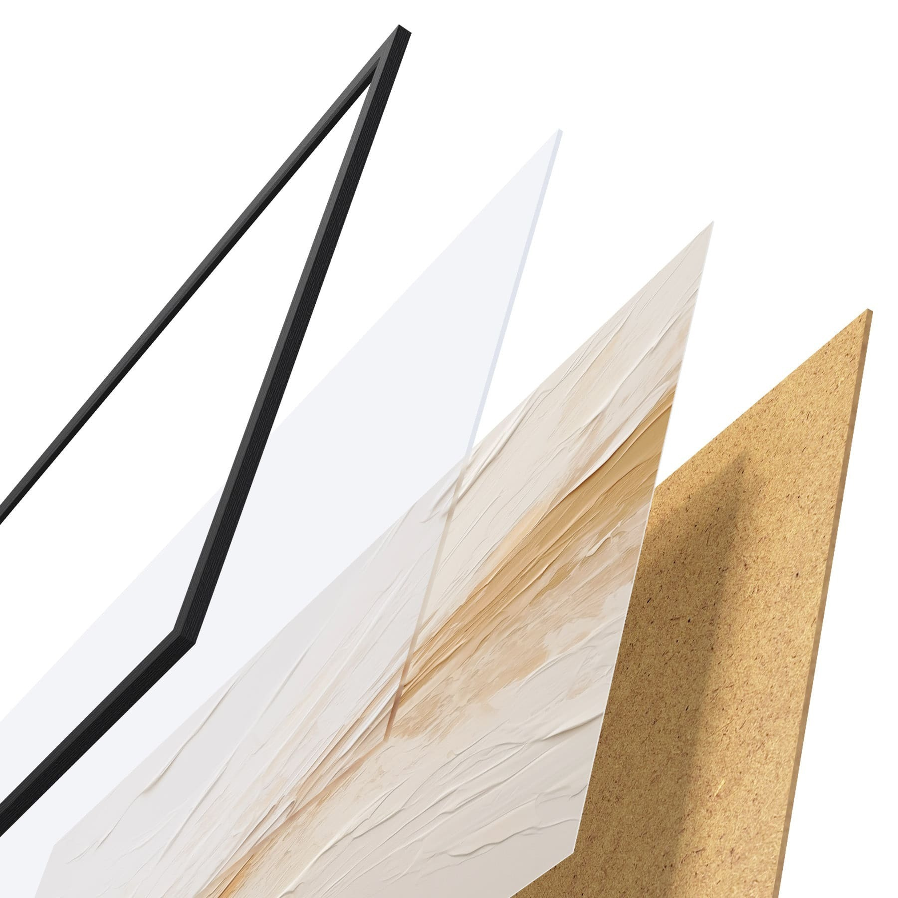 Plakatą sudaro rėmas, pleksiklas, atspausdintas vaizdas ir medžio drožlių plokštės pagrindas. Plakatą galima iš karto pakabinti ant sienos dėl kitoje pusėje esančių laikiklių.