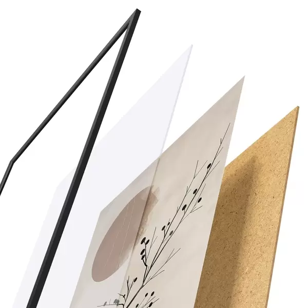 Plakatą sudaro rėmas, pleksiklas, atspausdintas vaizdas ir medžio drožlių plokštės pagrindas. Plakatą galima iš karto pakabinti ant sienos dėl kitoje pusėje esančių laikiklių.