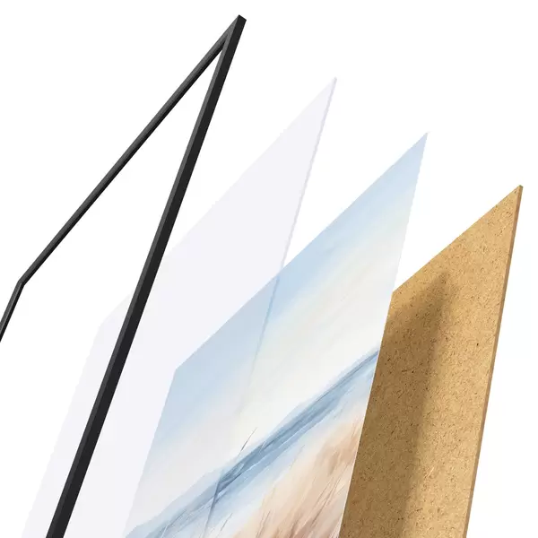 Plakatą sudaro rėmas, pleksiklas, atspausdintas vaizdas ir medžio drožlių plokštės pagrindas. Plakatą galima iš karto pakabinti ant sienos dėl kitoje pusėje esančių laikiklių.