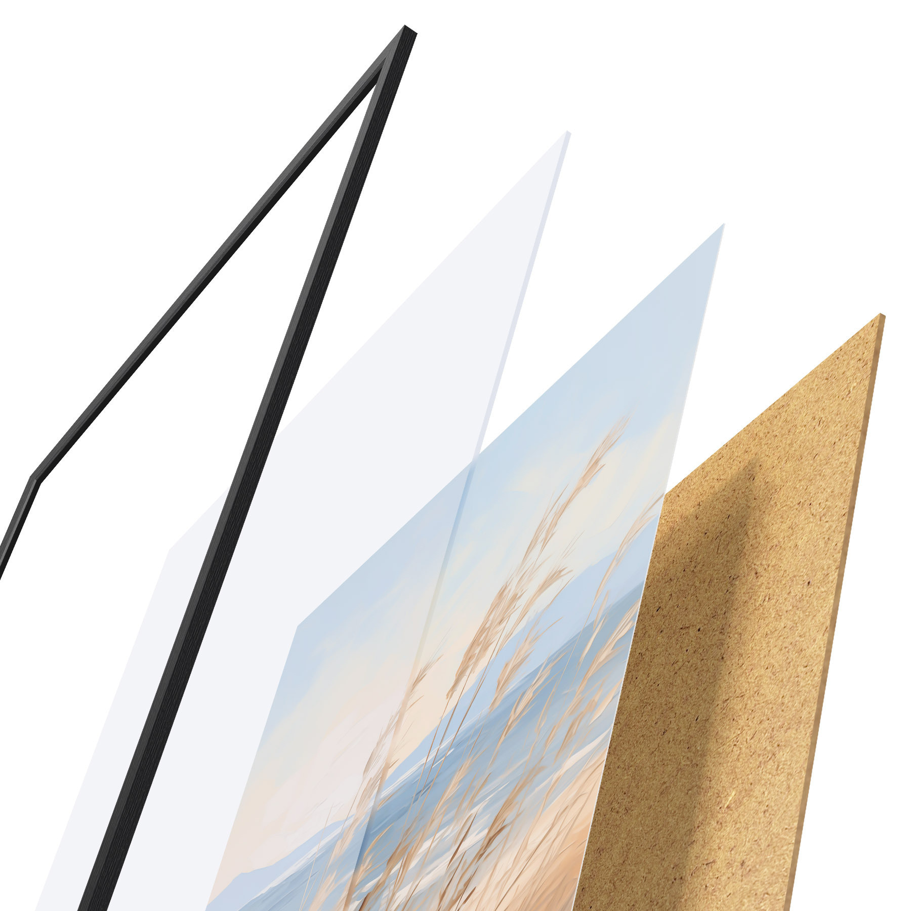 Plakatą sudaro rėmas, pleksiklas, atspausdintas vaizdas ir medžio drožlių plokštės pagrindas. Plakatą galima iš karto pakabinti ant sienos dėl kitoje pusėje esančių laikiklių.