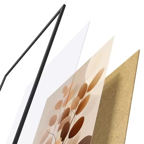 Plakatą sudaro rėmas, pleksiklas, atspausdintas vaizdas ir medžio drožlių plokštės pagrindas. Plakatą galima iš karto pakabinti ant sienos dėl kitoje pusėje esančių laikiklių.