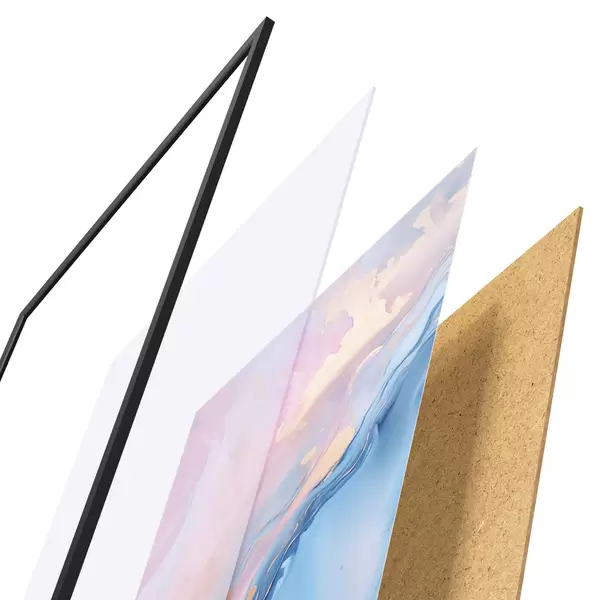 Plakatą sudaro rėmas, pleksiklas, atspausdintas vaizdas ir medžio drožlių plokštės pagrindas. Plakatą galima iš karto pakabinti ant sienos dėl kitoje pusėje esančių laikiklių.