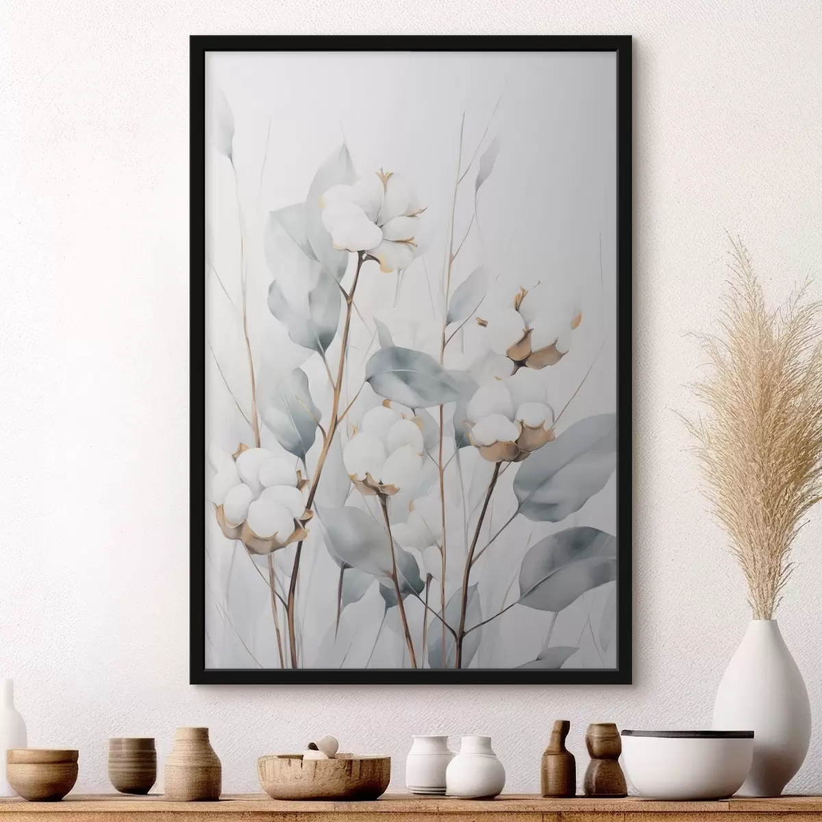 Plakatas Balta medvilnės augalas su šviesiai mėlynai žaliais lapais prieš šviesų foną f48743
