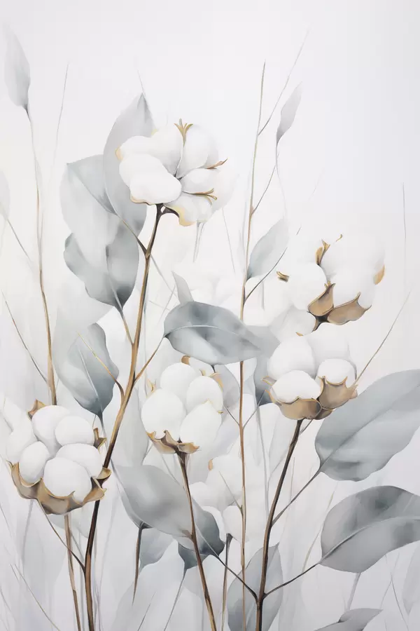 Plakatas Balta medvilnės augalas su šviesiai mėlynai žaliais lapais prieš šviesų foną f48743