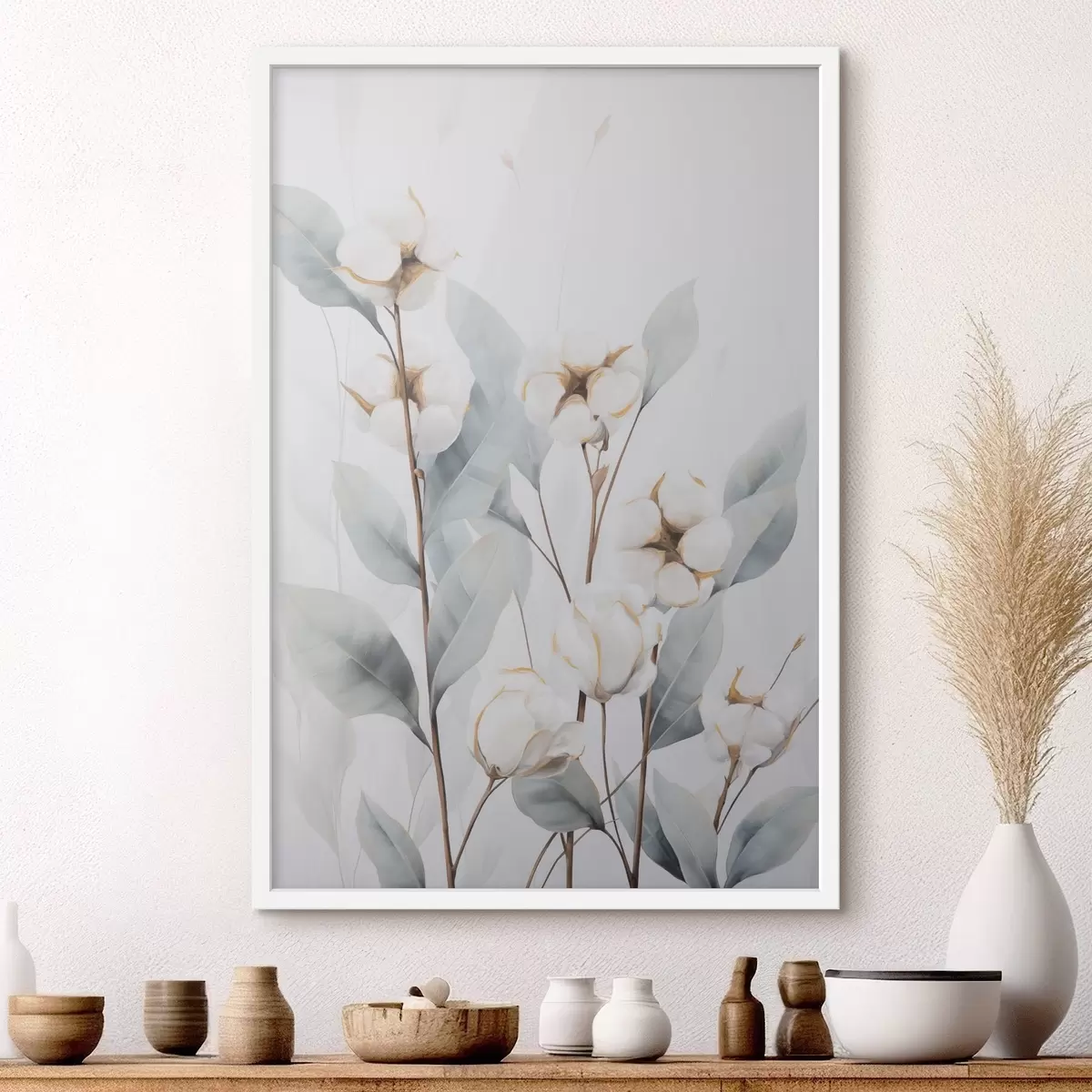 Plakatas Balta medvilnės augalas su šviesiai mėlynai žaliais lapais prieš šviesų foną f48744