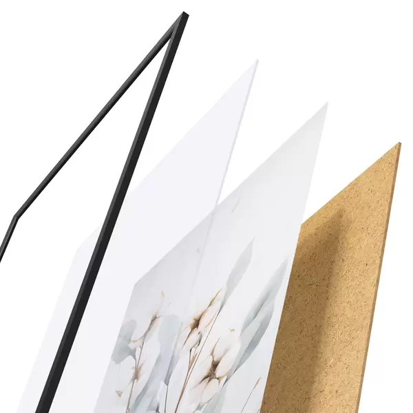 Plakatą sudaro rėmas, pleksiklas, atspausdintas vaizdas ir medžio drožlių plokštės pagrindas. Plakatą galima iš karto pakabinti ant sienos dėl kitoje pusėje esančių laikiklių.
