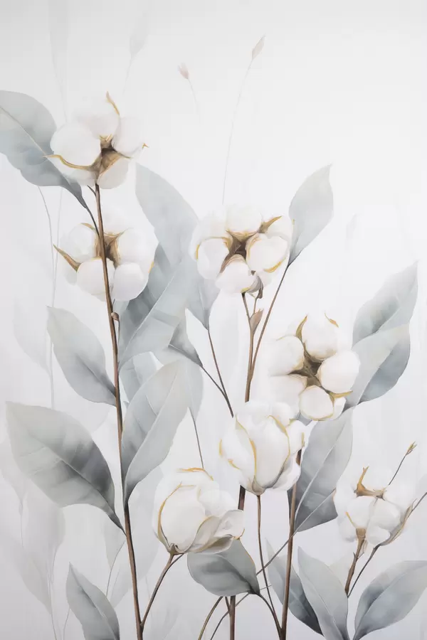 Plakatas Balta medvilnės augalas su šviesiai mėlynai žaliais lapais prieš šviesų foną f48744