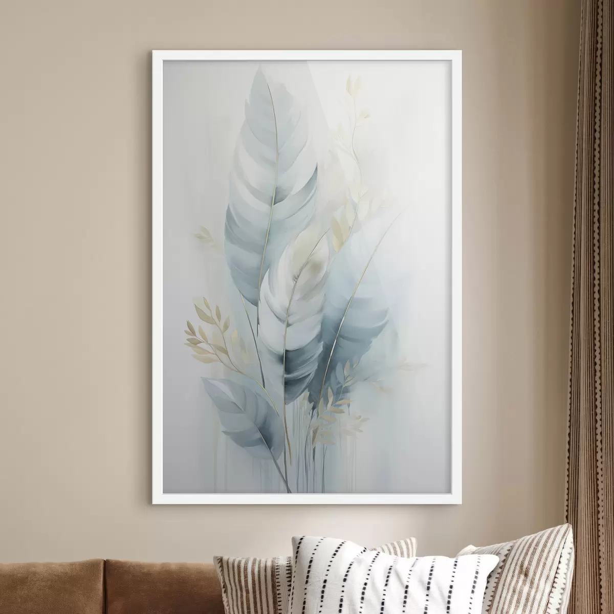 Plakatas Didelės, švelnios plunksnos mėlynų ir baltų atspalvių su subtiliais smėlio spalvos lapais f48749