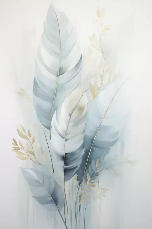 Plakatas Didelės, švelnios plunksnos mėlynų ir baltų atspalvių su subtiliais smėlio spalvos lapais f48749