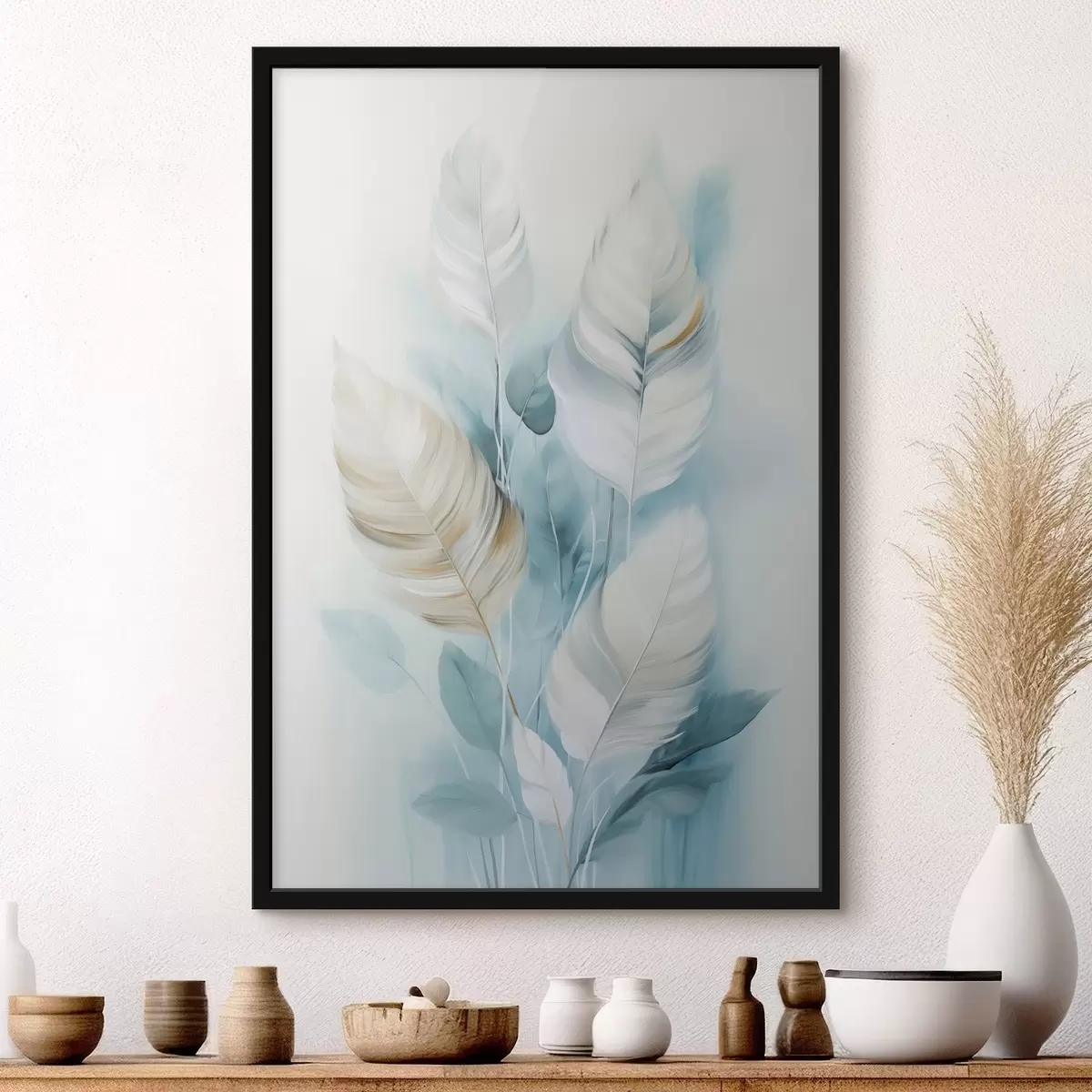 Plakatas Didelės, švelnios plunksnos mėlynų ir baltų atspalvių su subtiliais smėlio spalvos lapais f48750
