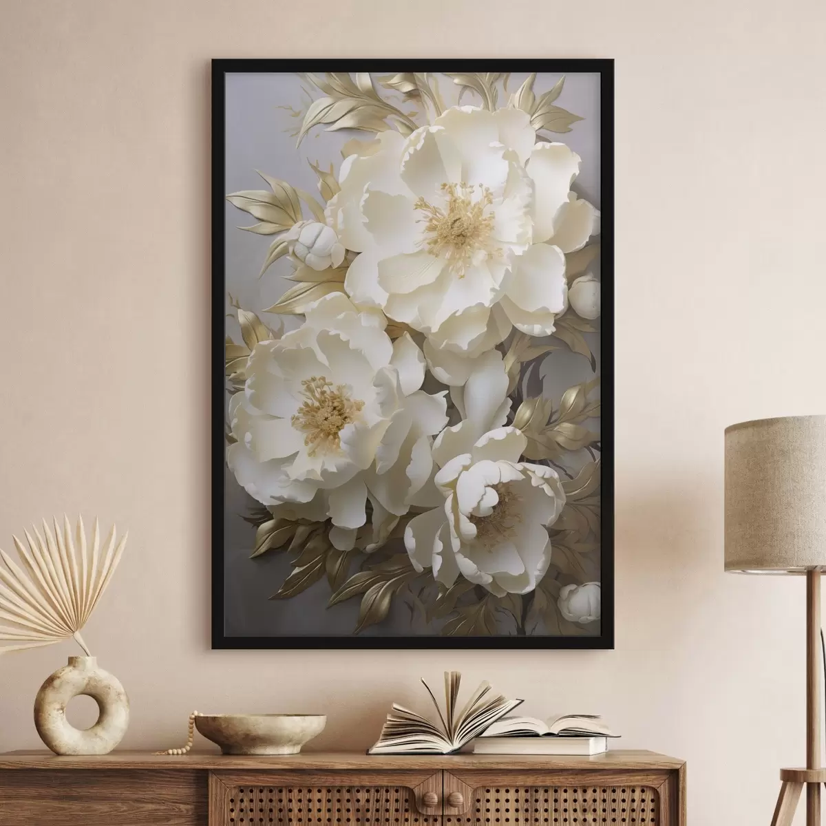 Plakatas Didelės baltos bijūnės su geltonais lapais ant pilko fono Ne f48754