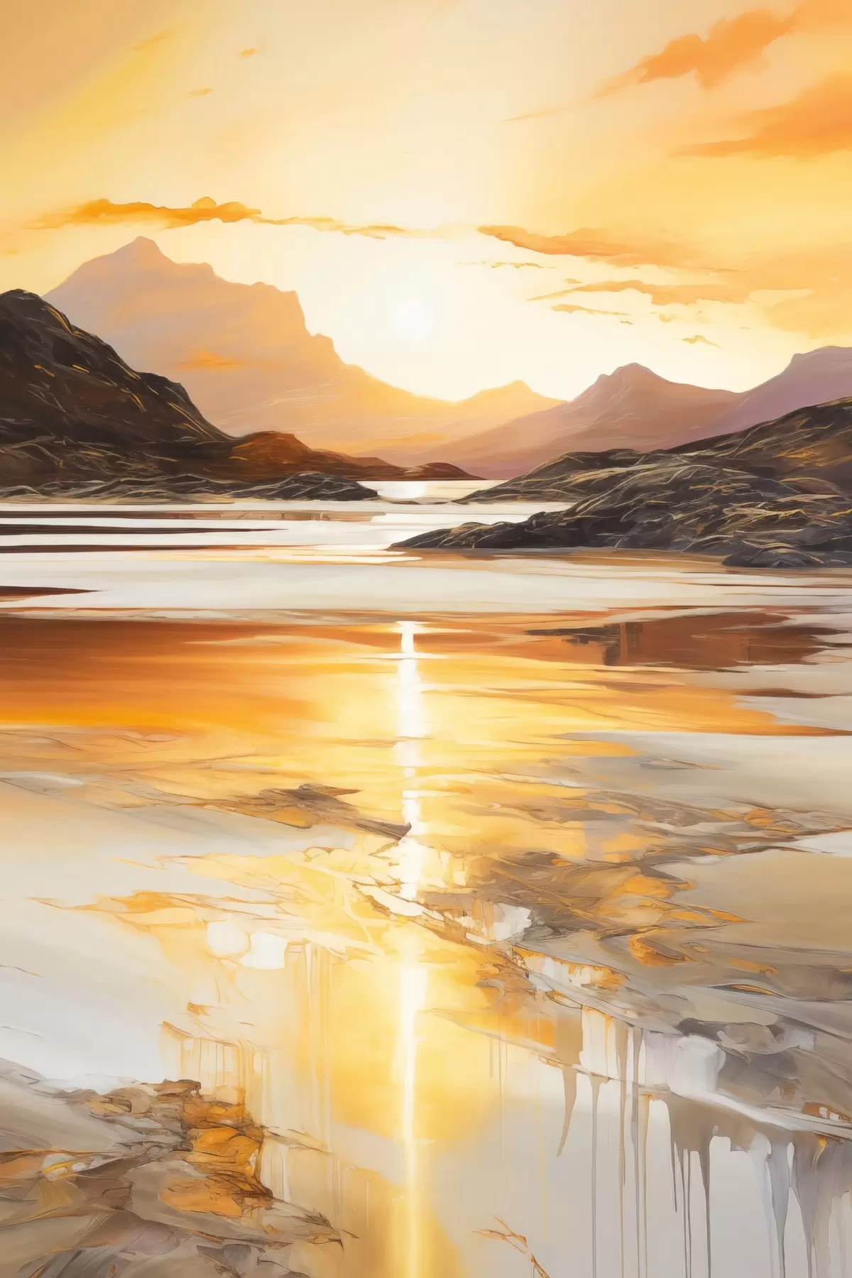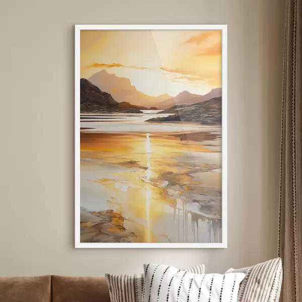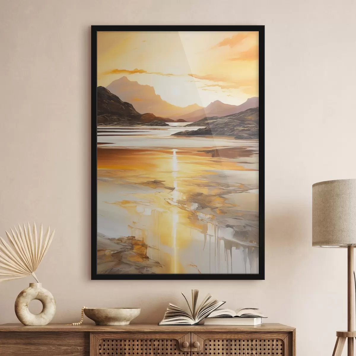 Plakatas Peizažas su upe ir kalnais po šiltu oranžiniu dangumi, saulėlydis Ne f48755