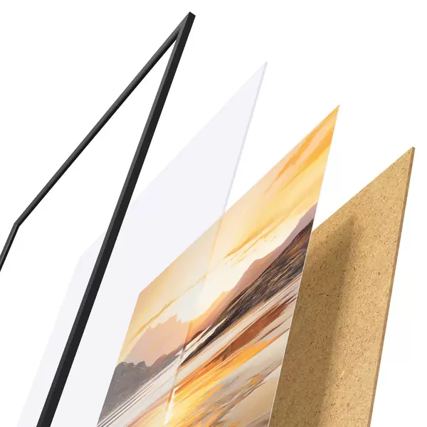 Plakatą sudaro rėmas, pleksiklas, atspausdintas vaizdas ir medžio drožlių plokštės pagrindas. Plakatą galima iš karto pakabinti ant sienos dėl kitoje pusėje esančių laikiklių.