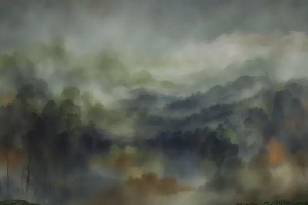 Plakatas Atmosferiškas, rūko apgaubtas miško peizažas žalios spalvos tonais Ne f48821