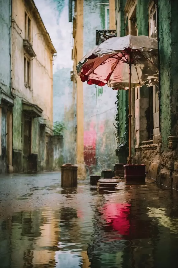 Plakatas Realistinis vaizdas: lietinga gatvė su skėčiu ir atspindžiais f48829