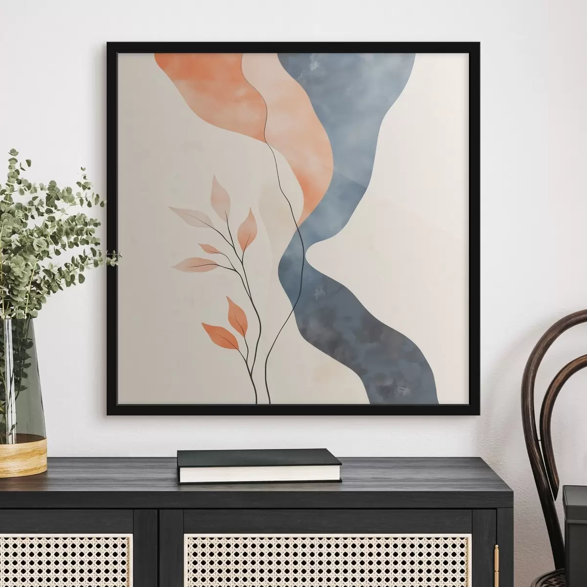 Plakatas Gėlių kompozicija su banguotomis linijomis mėlynos ir oranžinės spalvų paletėje f48837