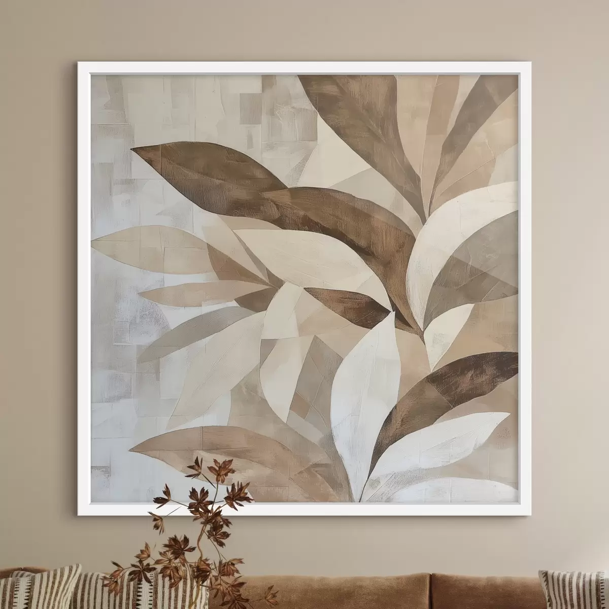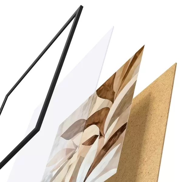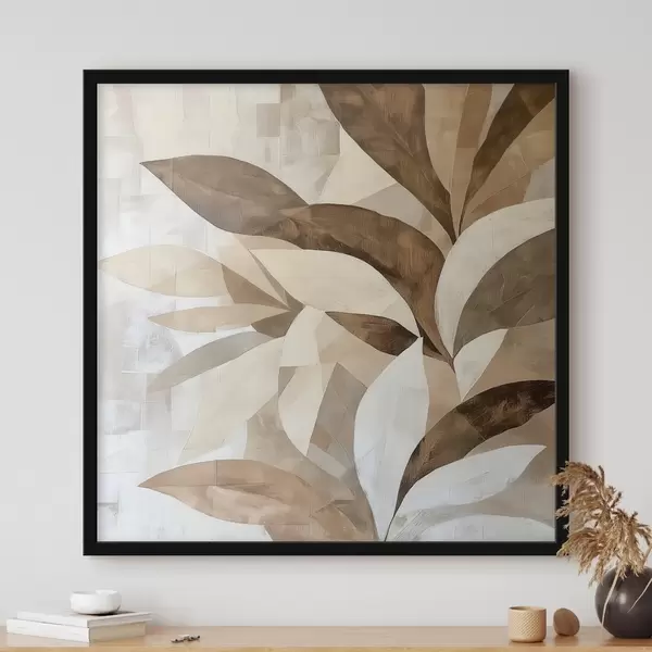 Plakatas Abstrakti gėlių kompozicija su dideliais lapais rudos ir smėlio spalvų tonais f48848