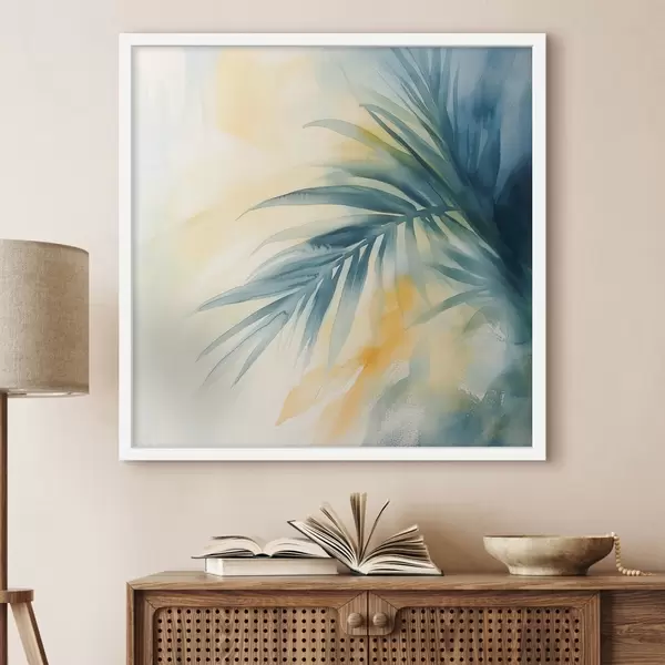 Plakatas Tropinių palmių lapai mėlynos ir turkio spalvų paletėje šiltų akvarelės dėmių fone Ne f48849