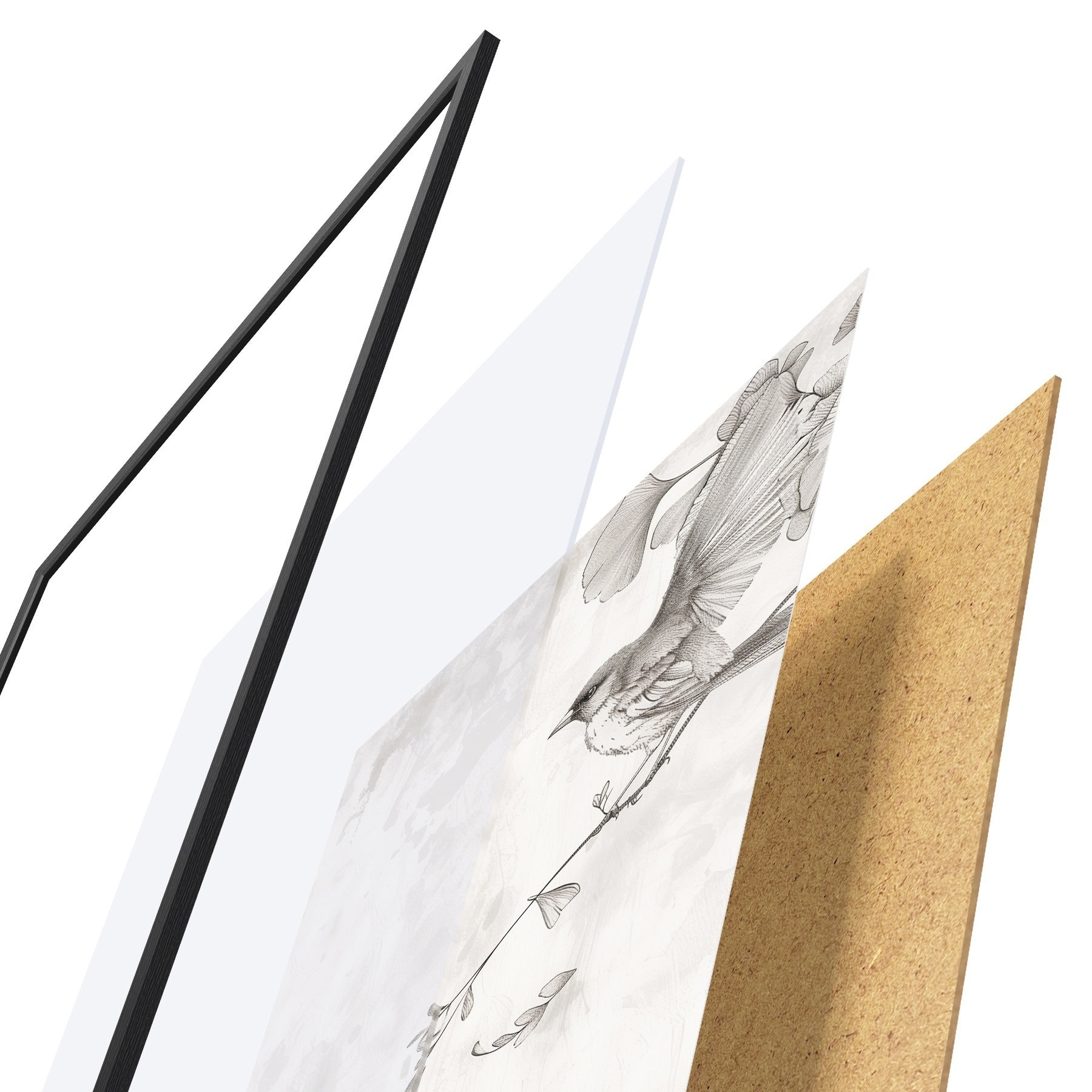 Plakatą sudaro rėmas, pleksiklas, atspausdintas vaizdas ir medžio drožlių plokštės pagrindas. Plakatą galima iš karto pakabinti ant sienos dėl kitoje pusėje esančių laikiklių.