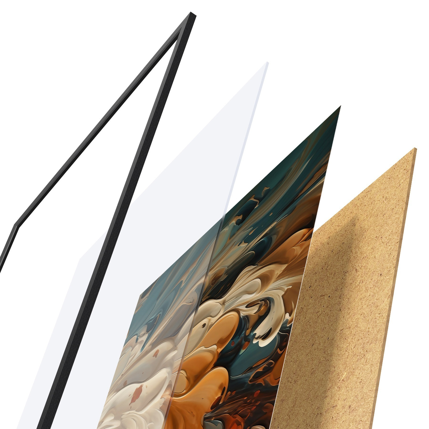 Plakatą sudaro rėmas, pleksiklas, atspausdintas vaizdas ir medžio drožlių plokštės pagrindas. Plakatą galima iš karto pakabinti ant sienos dėl kitoje pusėje esančių laikiklių.