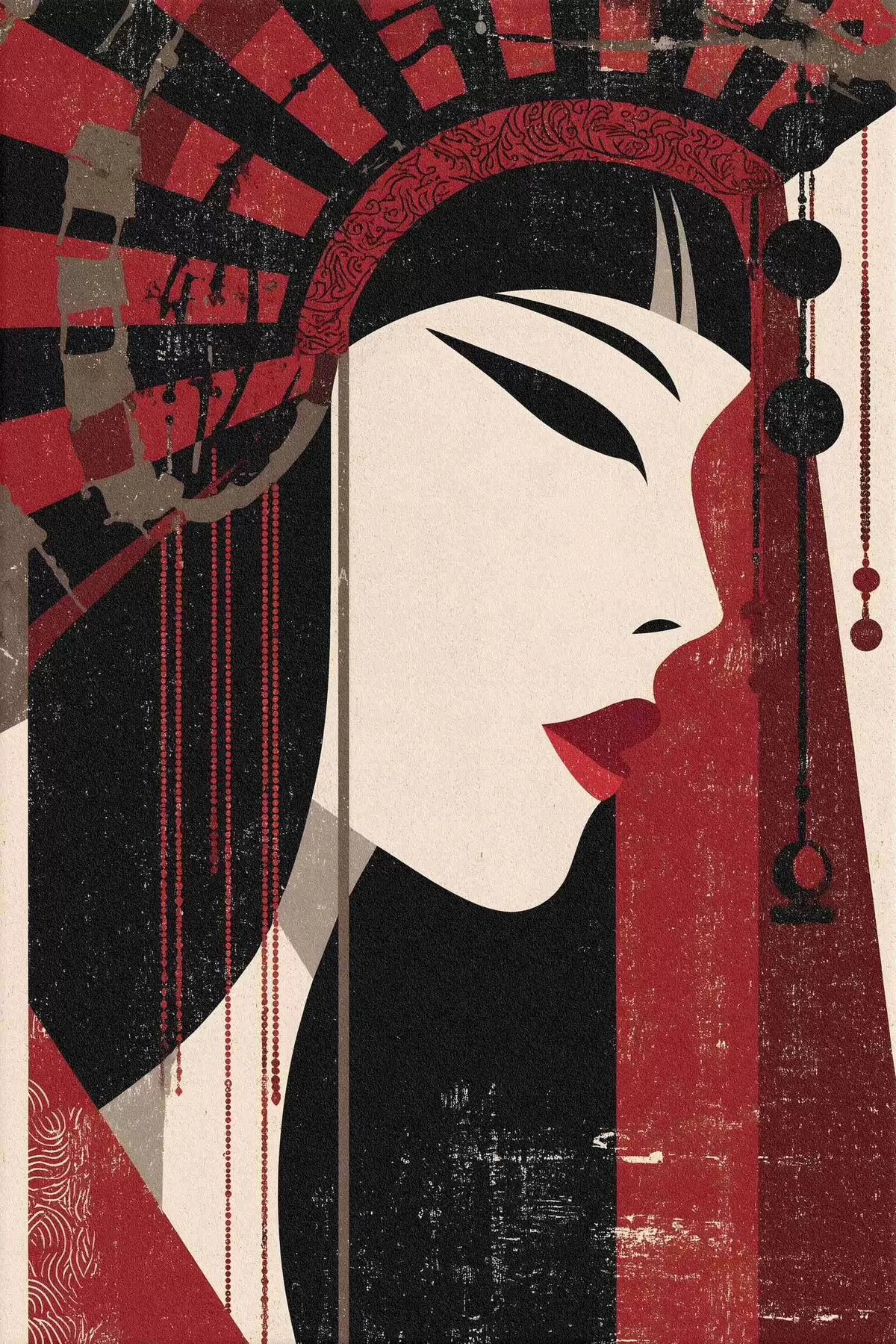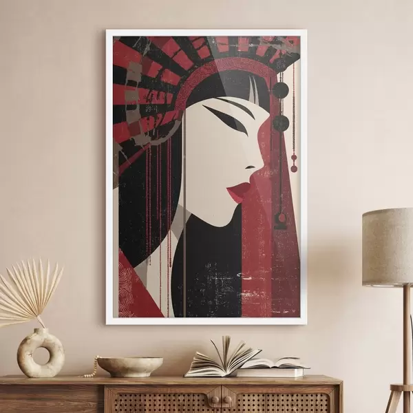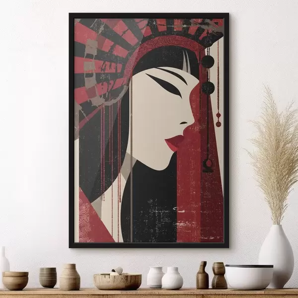 Plakatas stilizuotas moters portretas, įkvėptas japonų ir art deco estetikos f48993