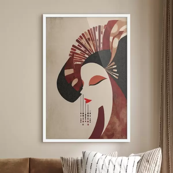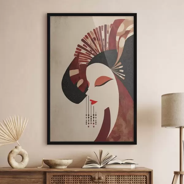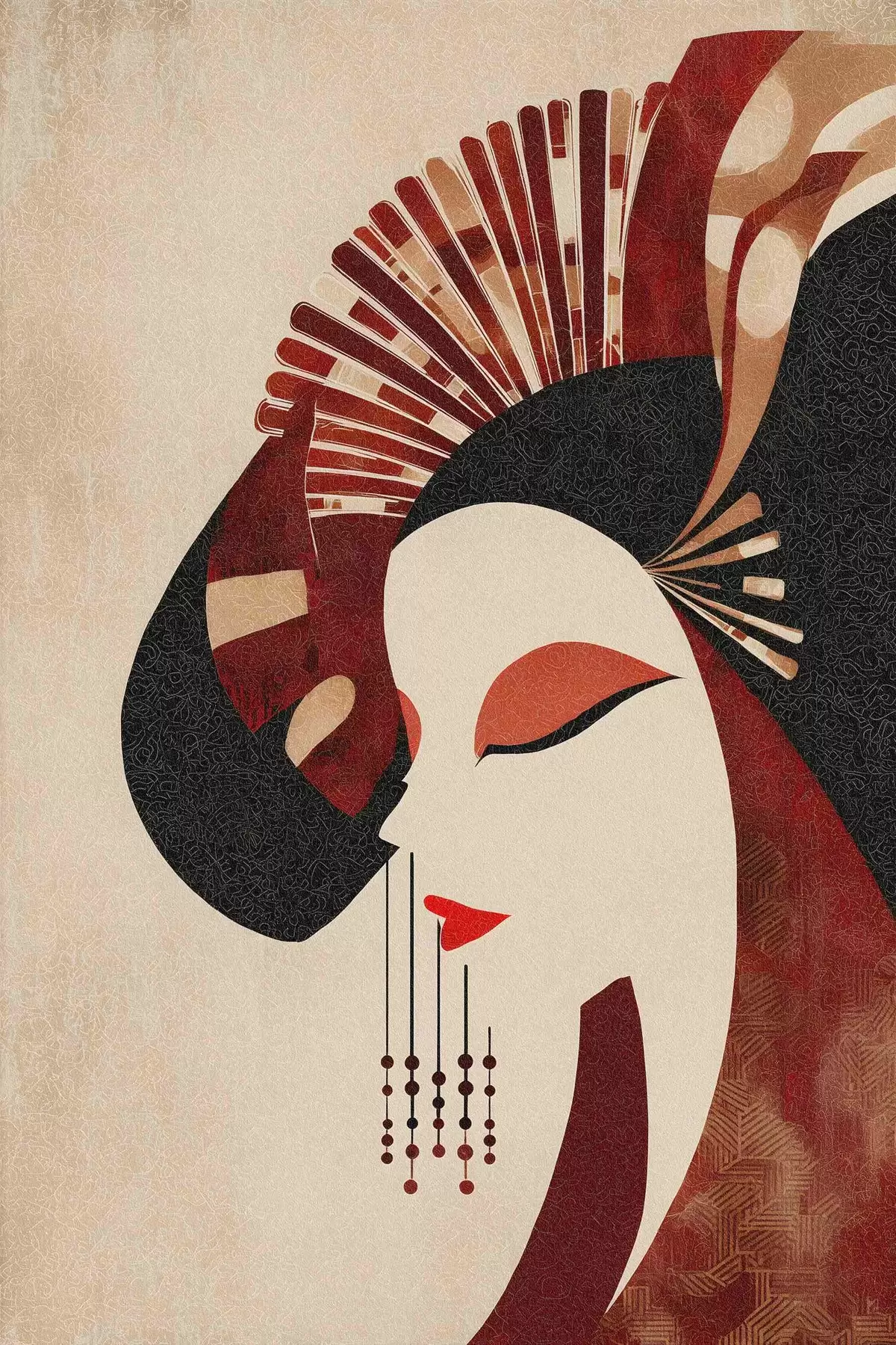 Plakatas stilizuotas moters portretas, įkvėptas japonų ir art deco estetikos f48994