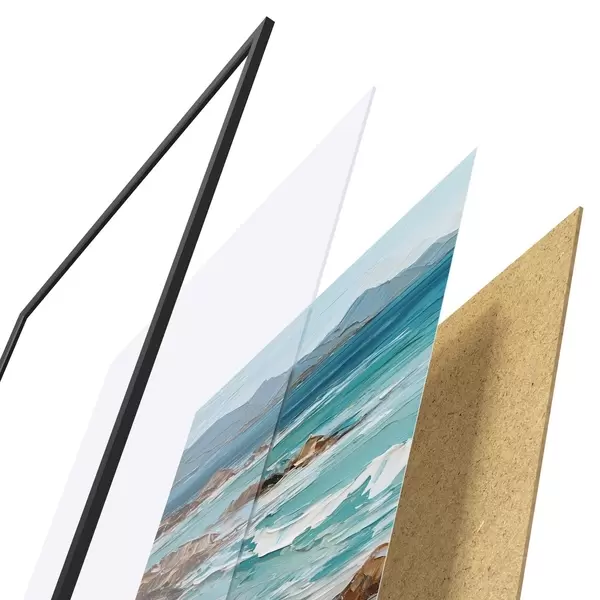 Plakatą sudaro rėmas, pleksiklas, atspausdintas vaizdas ir medžio drožlių plokštės pagrindas. Plakatą galima iš karto pakabinti ant sienos dėl kitoje pusėje esančių laikiklių.