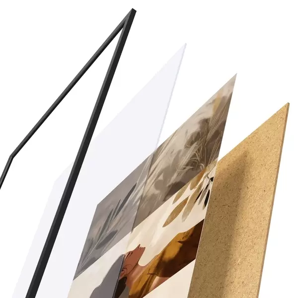 Plakatą sudaro rėmas, pleksiklas, atspausdintas vaizdas ir medžio drožlių plokštės pagrindas. Plakatą galima iš karto pakabinti ant sienos dėl kitoje pusėje esančių laikiklių.