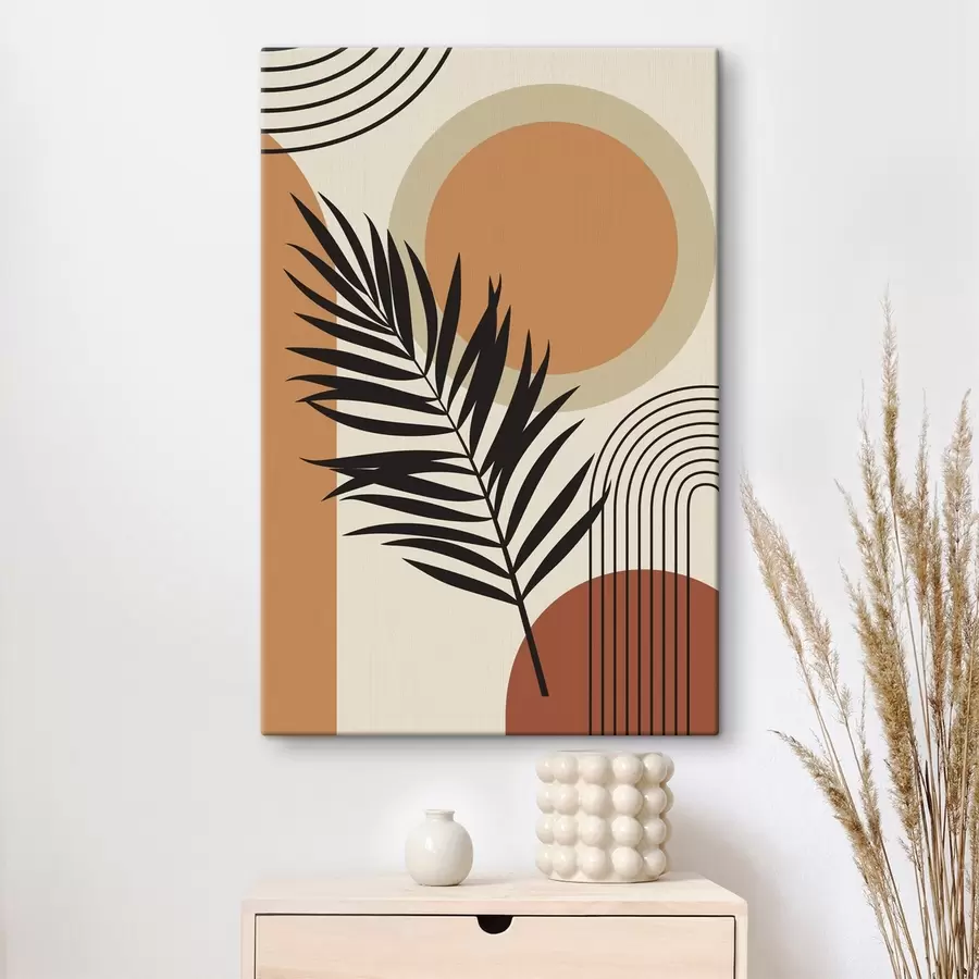 Mėlynos, oranžinės ir rudos spalvos abstrakčios geometrinės figūros sukuria modernią minimalistinę kompoziciją