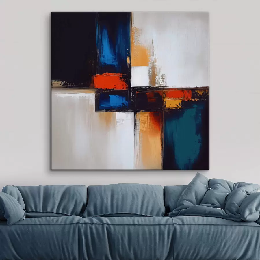 Abstraktus kubizmas, mėlynos, oranžinės, baltos spalvos potėpiai, apskrita figūra